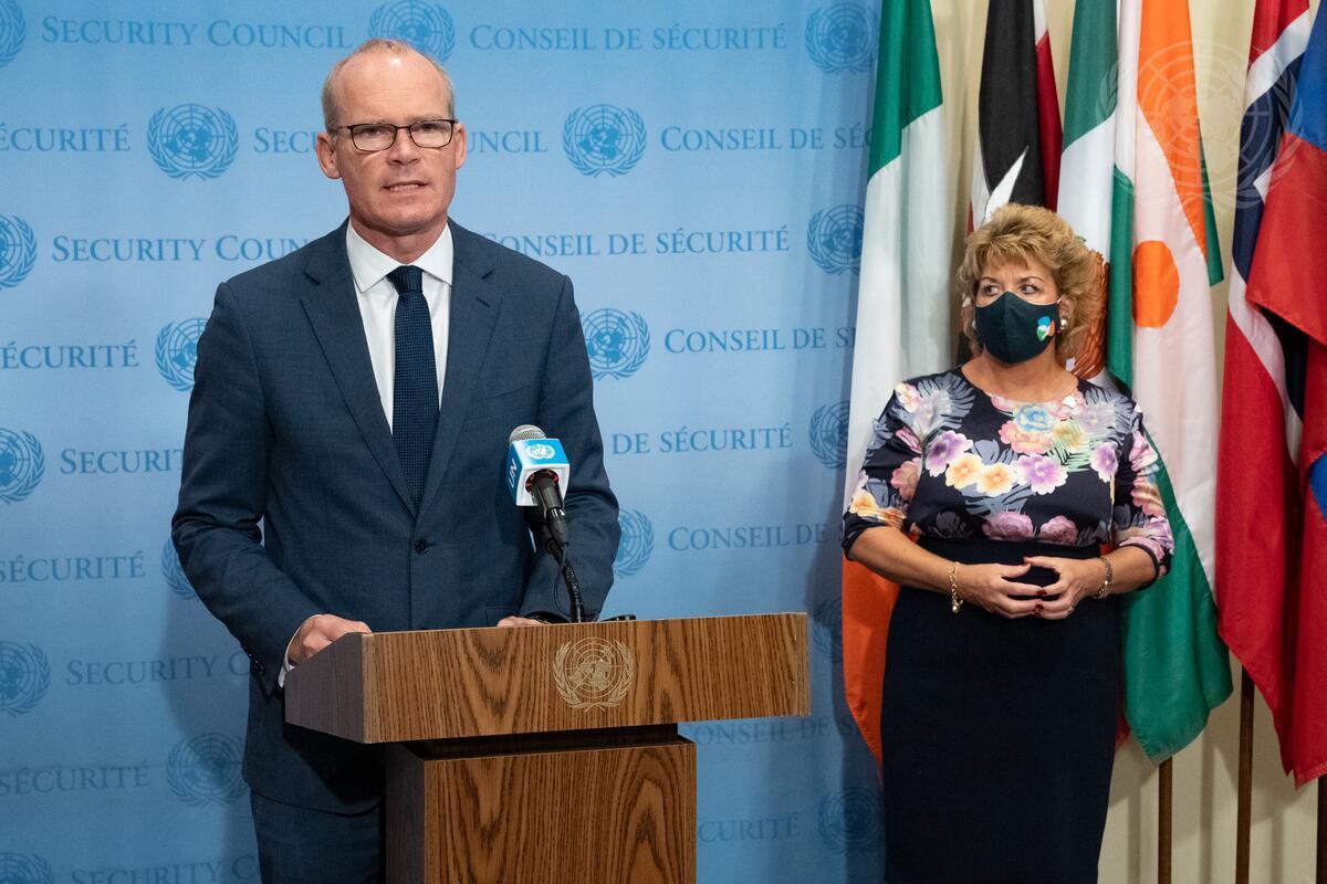 Simon Coveney (left), Minister for Foreign Affairs and Defence of Ireland and President of the Security Council for the month of September, briefs journalists ahead of an informal interactive dialogue with the League of Arab States. Also present is Geraldine Byrne Nason, Permanent Representative of Ireland to the United Nations.
