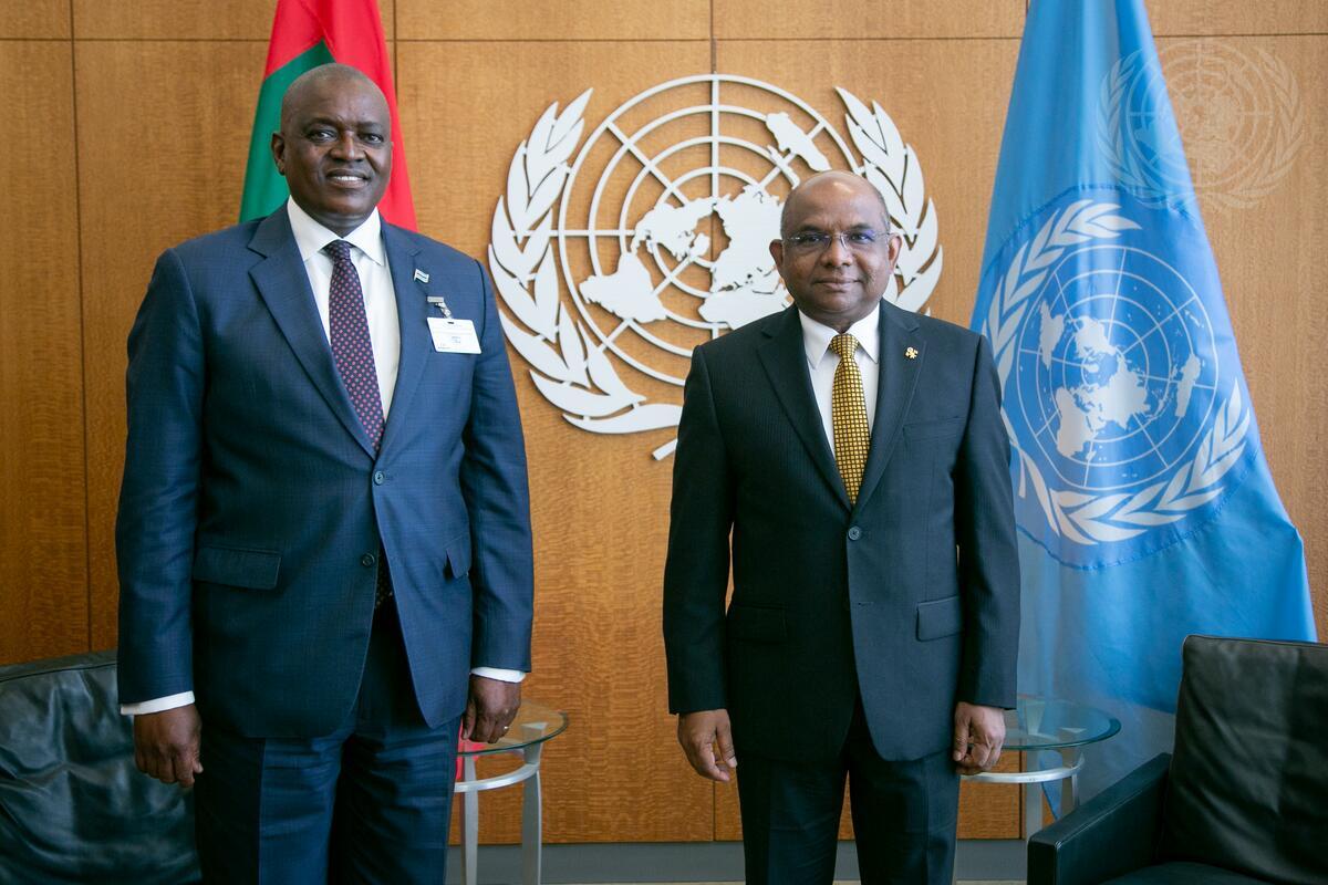Abdulla Shahid (right), President of the seventy-sixth session of the United Nations General Assembly, meets with Mokgweetsi Eric Keabetswe Masisi, President of the Republic of Botswana.