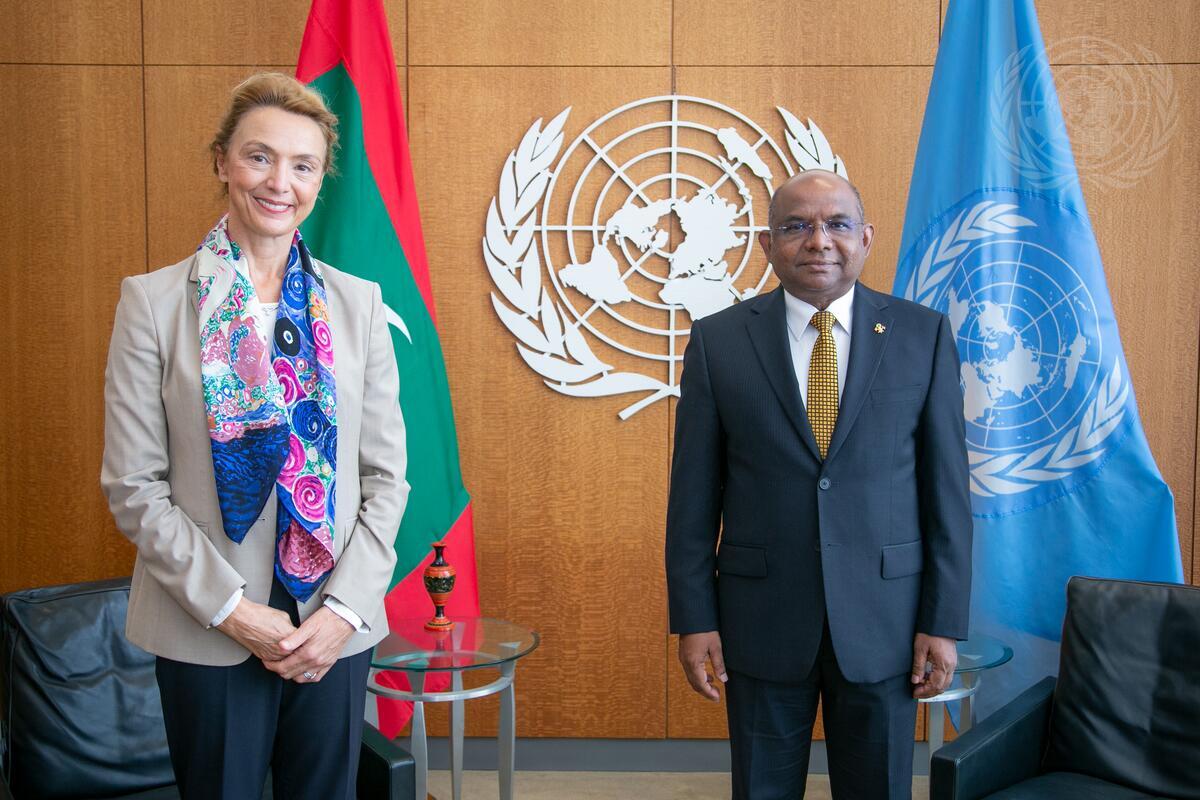 Abdulla Shahid (right), President of the seventy-sixth session of the United Nations General Assembly, meets with Marija Pejčinović Burić, Secretary General of the Council of Europe.
