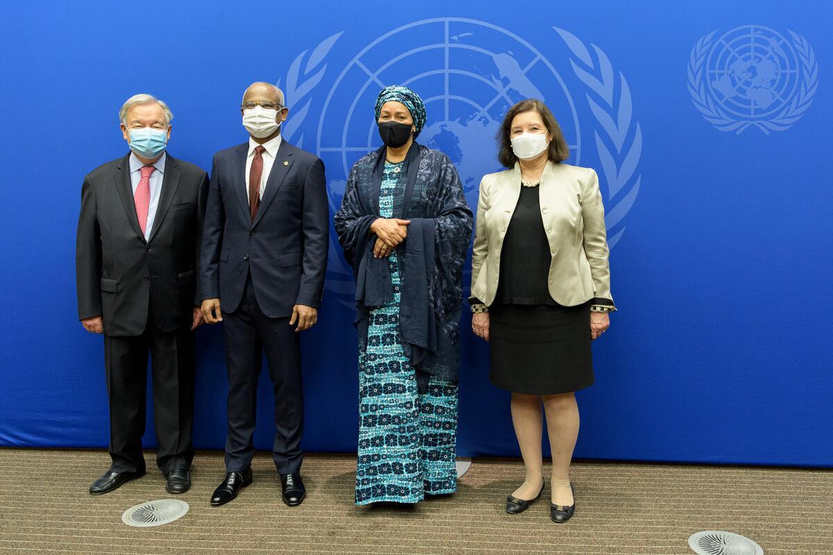 Secretary-General António Guterres (left) meets with Ibrahim Mohamed Solih (second from left), President of the Republic of Maldives, on the side of the general debate of the UN General Assembly’s seventy-sixth session.