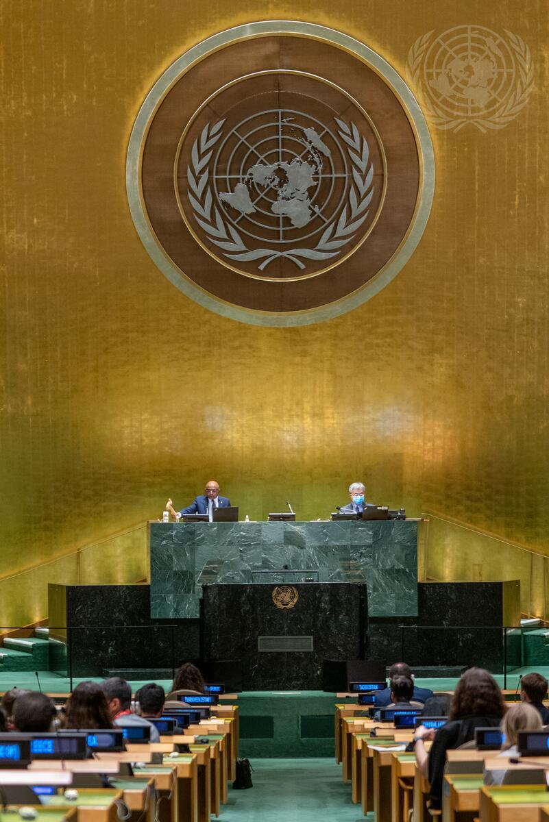 Abdulla Shahid (left at dais), President of the seventy-sixth session of the United Nations General Assembly, closes the general debate of the General Assembly’s seventy-sixth session.
