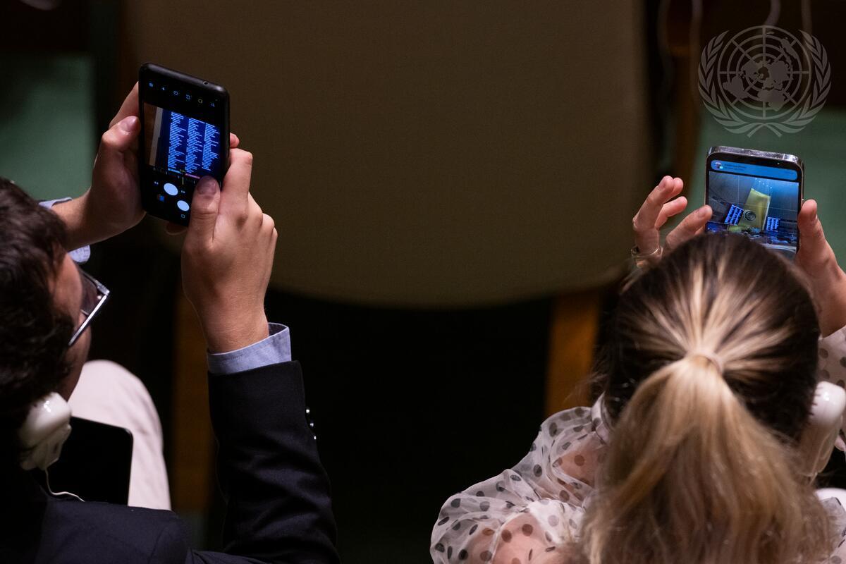 Two delegates take photos of the recorded vote.