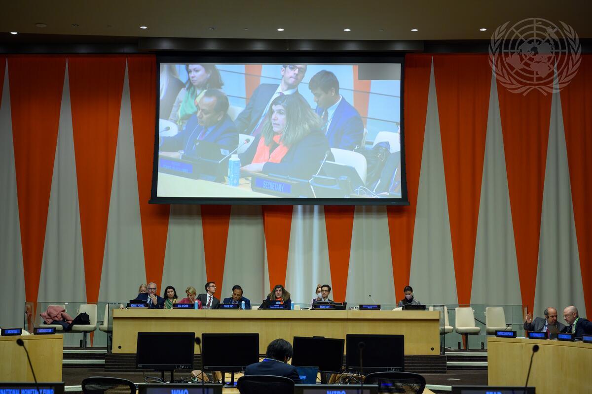 Lachezara Stoeva (third from right at table and on screen), President of the Economic and Social Council (ECOSOC) 2023 Session and Permanent Representative of the Republic of Bulgaria to the United Nations, addresses the joint meeting of the Economic and Social Council (ECOSOC) and the Peacebuilding Commission: "Peacebuilding, sustaining peace and sustainable development: Towards coherence and impact on the ground."