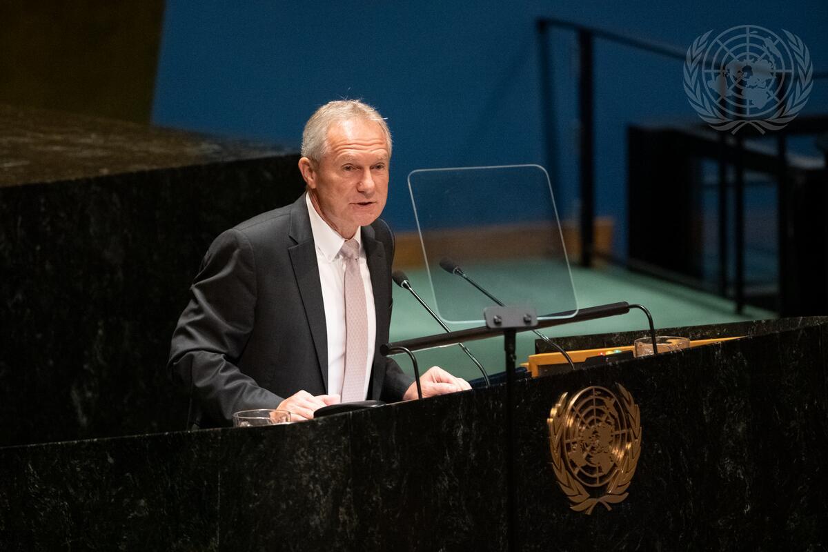 Csaba Kőrösi, President of the seventy-seventh session of the United Nations General Assembly, addresses the General Assembly meeting.