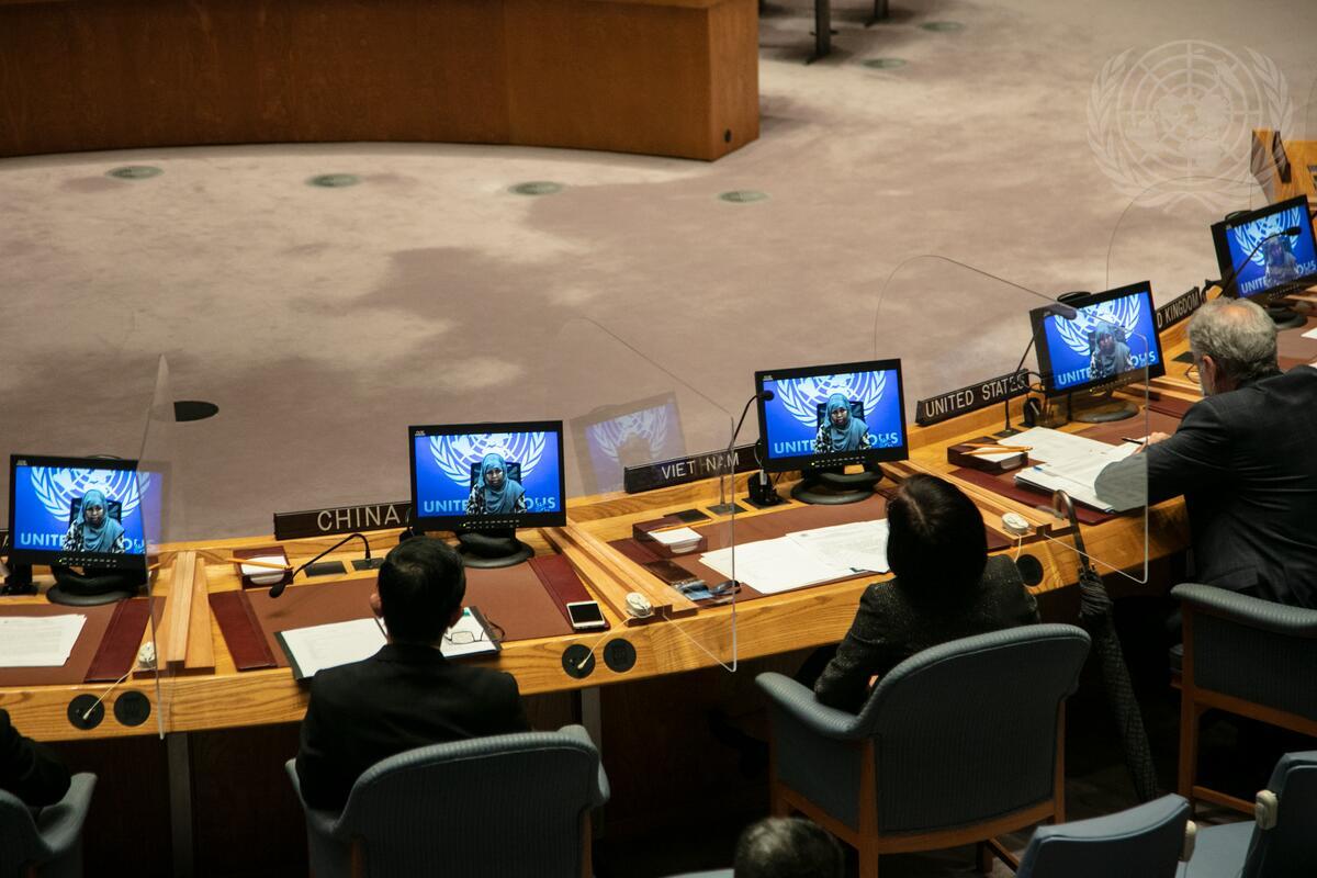 Shukria Dini (on screens), Co-founder and Executive Director, Somali Women’s Studies Centre, addresses the Security Council meeting on the situation in Somalia.