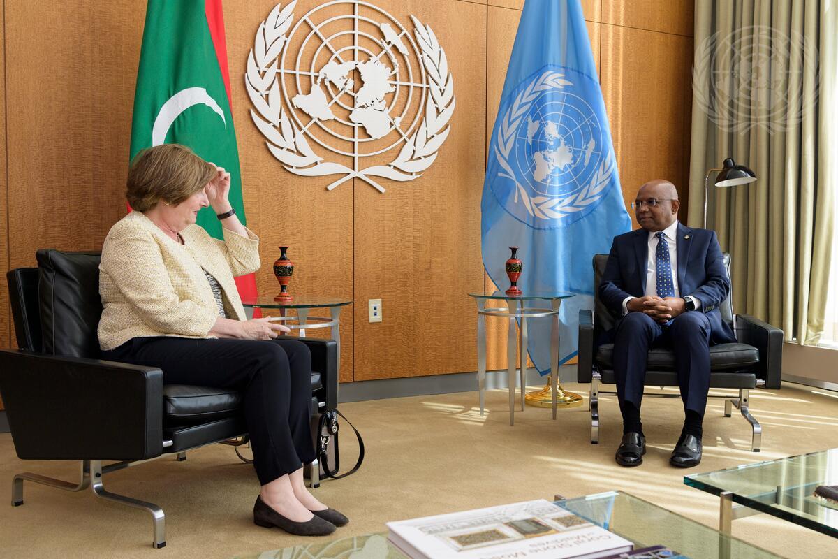 Abdulla Shahid (right), President of the seventy-sixth session of the United Nations General Assembly, meets with Siliva Fernandez de Gurmendi, President of the Assembly of States Parties to the Rome Statute of the International Criminal Court.