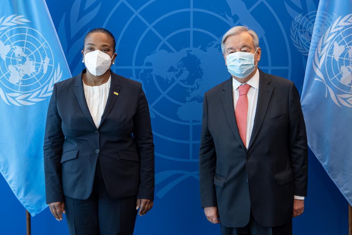 Secretary-General António Guterres (right) meets with Edite Ramos da Costa Ten Jua, Minister for Foreign Affairs of the Democratic Republic of Sao Tome and Principe.