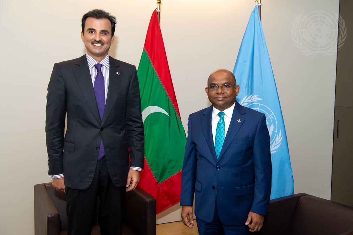 Abdulla Shahid (right), President of the seventy-sixth session of the United Nations General Assembly, meets with Sheikh Tamim bin Hamad Al Thani, Amir of the State of Qatar.