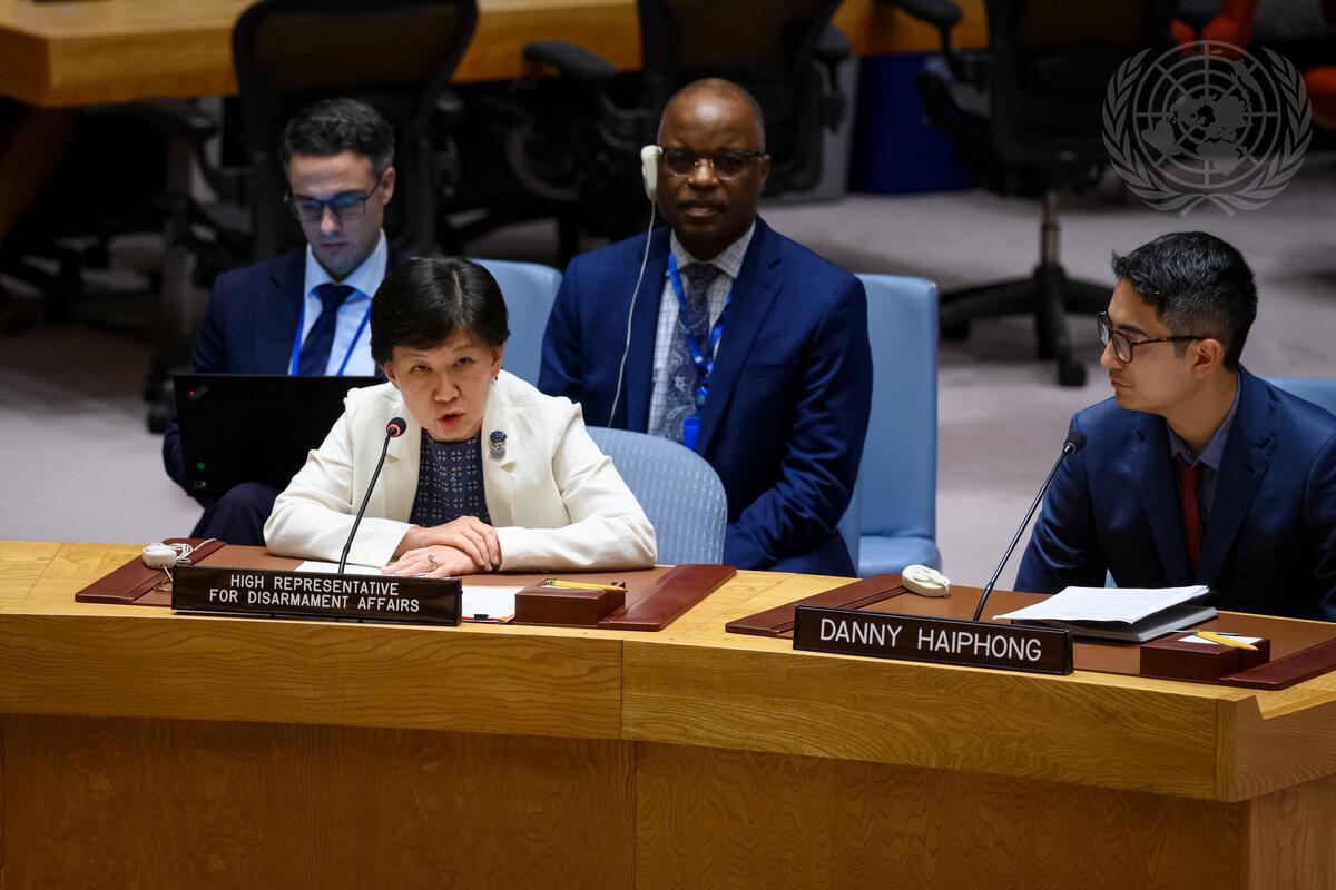 Caption Description Izumi Nakamitsu (left), Under-Secretary-General and High Representative for Disarmament Affairs, briefs the Security Council meeting on threats to international peace and security. At right is Danny Haiphong, Journalist.
