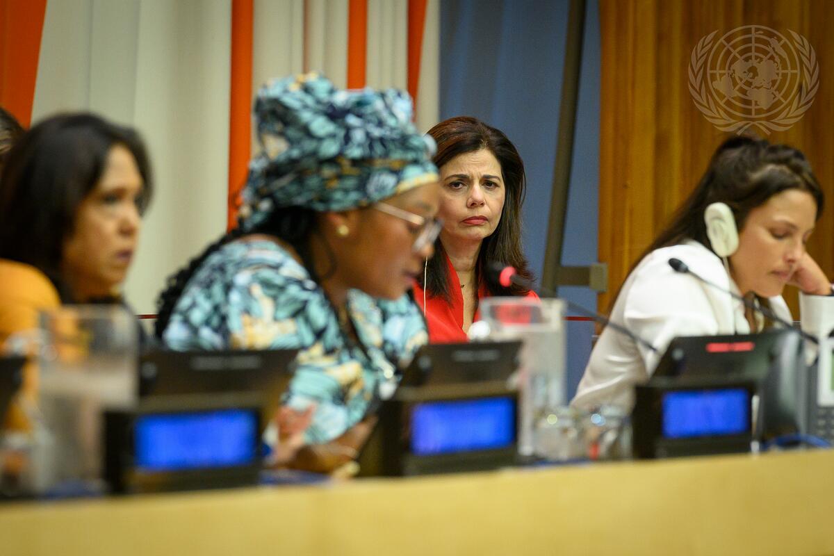 A view of Moderator Margaret Besheer (centre right), United Nations Resident Correspondent for Voice of America (VOA), as Aline Mwamini, a survivor of sexual violence in conflict from the Democratic Republic of the Congo, reads her testimony during the event held to commemorate the 15-Year anniversary of the establishment of the mandate on Sexual Violence in Conflict.