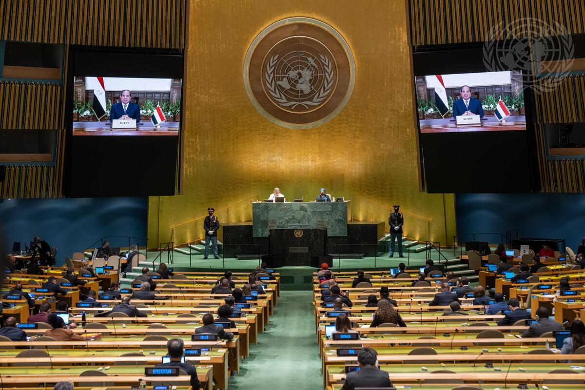 Abdel Fattah Al Sisi (on screens), President of the Arab Republic of Egypt, addresses the general debate of the General Assembly’s seventy-sixth session.