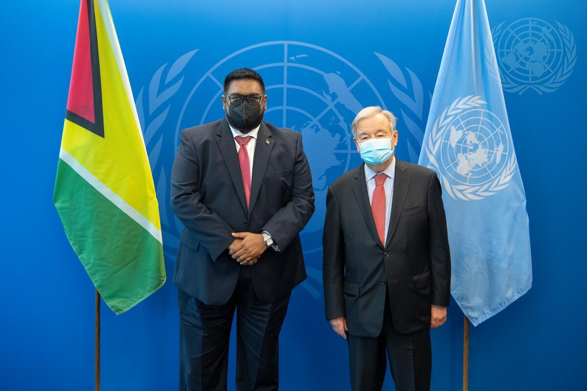 Secretary-General António Guterres (right) meets with President of the Co-operative Republic of Guyana.