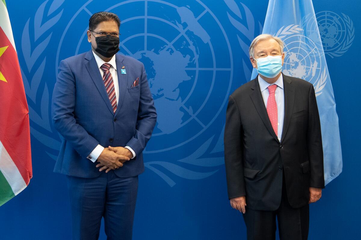 Secretary-General António Guterres (right) meets with Chandrikapersad Santokhi, President of the Republic of Suriname.