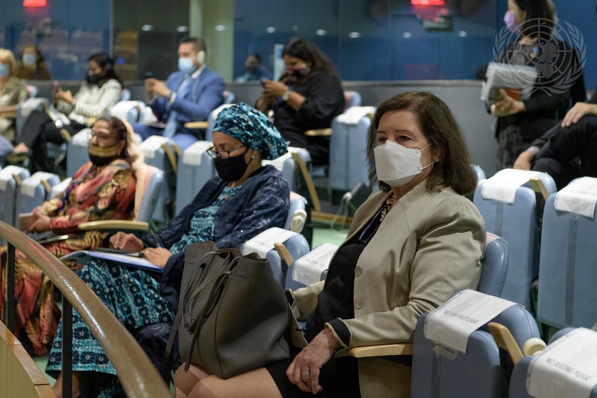 Maria Luiza Ribeiro Viotti (front, right), Chef de Cabinet to the Secretary-General, and Deputy Secretary-General Amina Mohammed (front, second from right), listen the remarks by Secretary-General António Guterres.