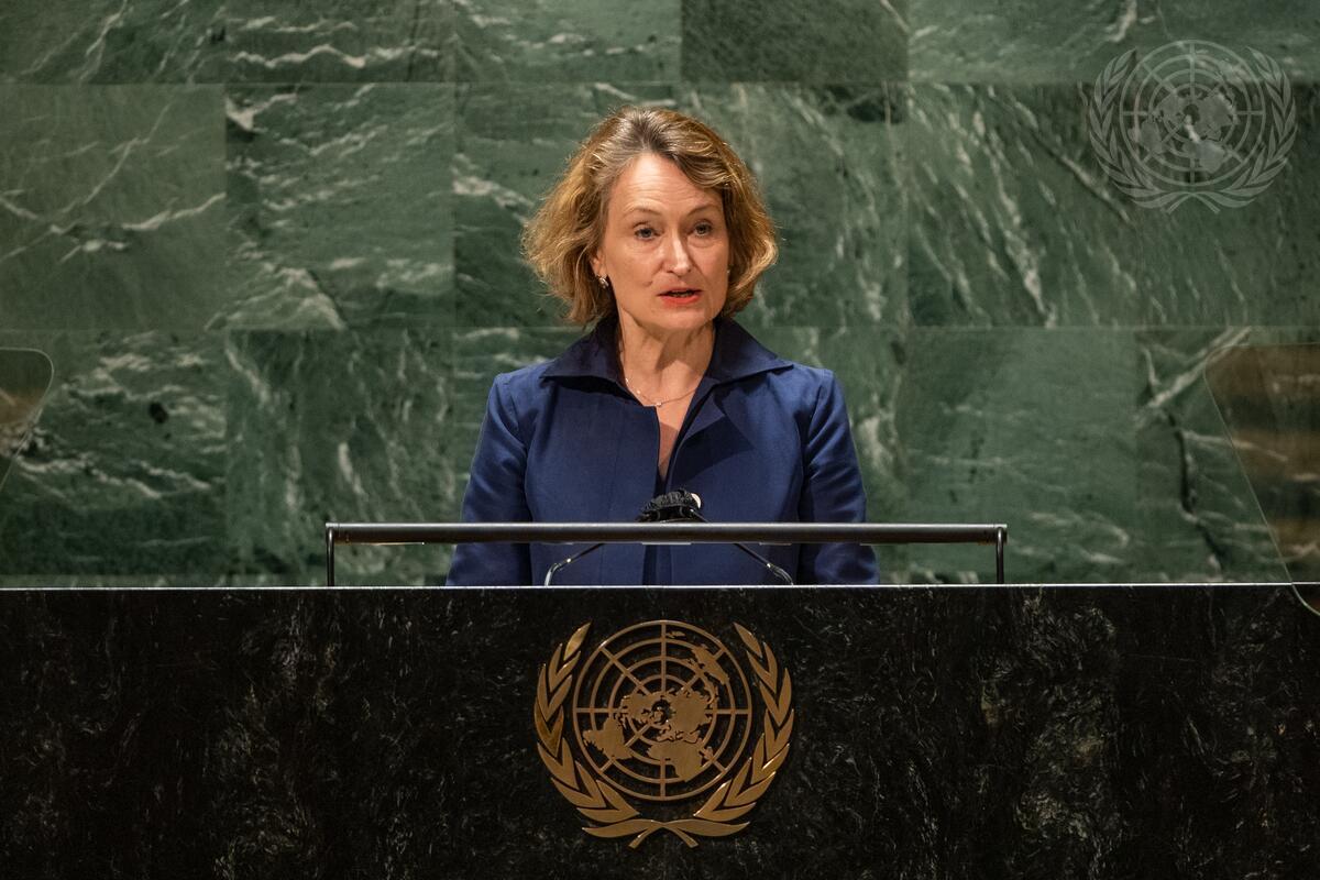 Ilze Brands Kehris, Assistant Secretary-General for Human Rights and Head of the Office of the High Commissioner for Human Rights (OHCHR) in New York, addresses the General Assembly high-level meeting to commemorate the twentieth anniversary of the adoption of the Durban Declaration and Programme of Action. The themes of the meeting are Reparations, racial justice and equality for people of African descent.