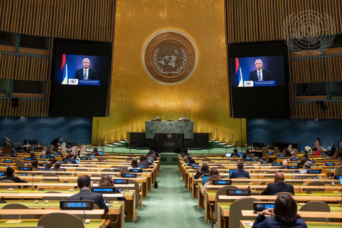 Pravind Kumar Jugnauth (on screens), Prime Minister, Minister for Defense, Home Affairs, and External Communications, Minister for Rodrigues, Outer Islands, and Territorial Integrity of the Republic of Mauritius, addresses the general debate of the General Assembly’s seventy-sixth session.