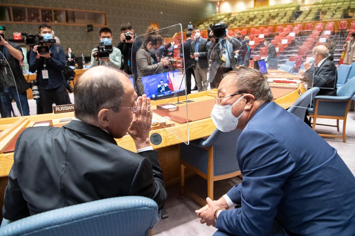 Sergey V. Lavrov (left), Minister for Foreign Affairs of the Russian Federation, speaks with Zhang Jun, Permanent Representative of China to the United Nations, ahead of the meeting with Secretary-General António Guterres and the Foreign MInisters of the five Permanent Members of the Security Council.