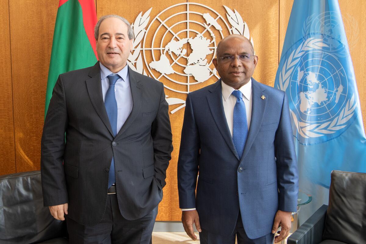 Abdulla Shahid (right), President of the seventy-sixth session of the United Nations General Assembly, meets with Fayssal Mekdad, Minister of Foreign Affairs and Expatriates of the Syrian Arab Republic.