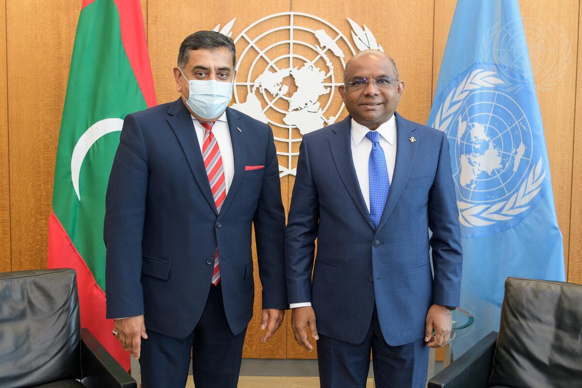 Abdulla Shahid (right), President of the seventy-sixth session of the United Nations General Assembly, meets with Tariq Ahmad, Minister of State for the Commonwealth, the United Nations and South Asia of the United Kingdom.