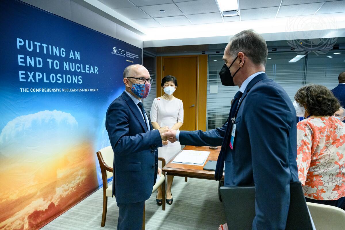 Rob Floyd (left), Executive Secretary of the Comprehensive Nuclear-Test-Ban Treaty Organization (CTBTO), greets Heiko Maas, Minister for Foreign Affairs of Germany. Also present is Izumi Nakamitsu (second from left), High Representative for Disarmament Affair.