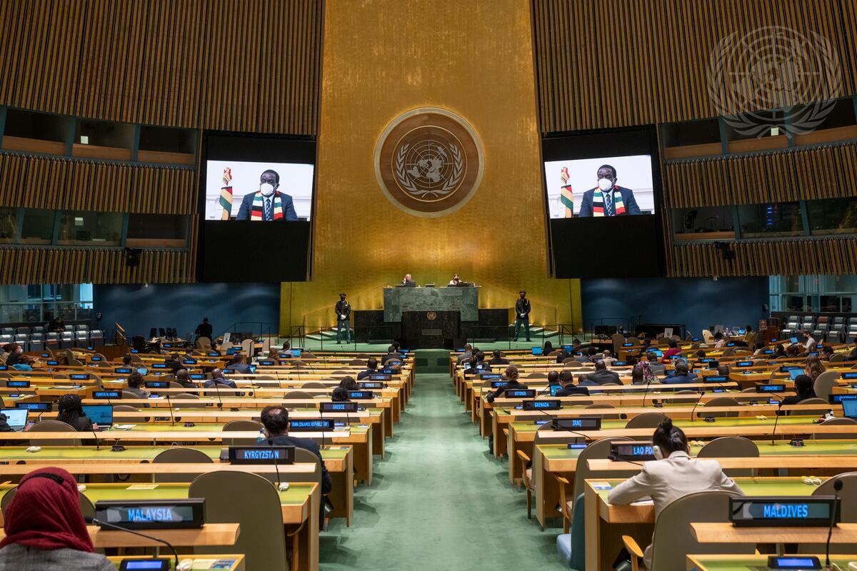 Emmerson Dambudzo Mnangagwa (on screens), President of the Republic of Zimbabwe, addresses the general debate of the General Assembly’s seventy-sixth session.