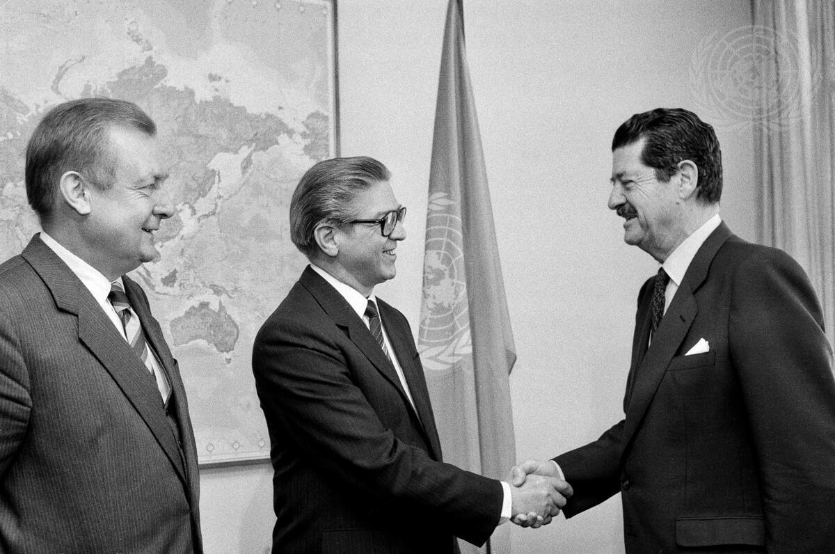 Jaime de Pinies (Spain), left, President of the special session of the General Assembly, greeting Gerd Koenic, Deputy Minister for Foreign Affairs of the German Democratic Republic (GDR) in his office at Headquarters. Looking on is Harry OTT, Permanent Representative to the UN from the GDR.