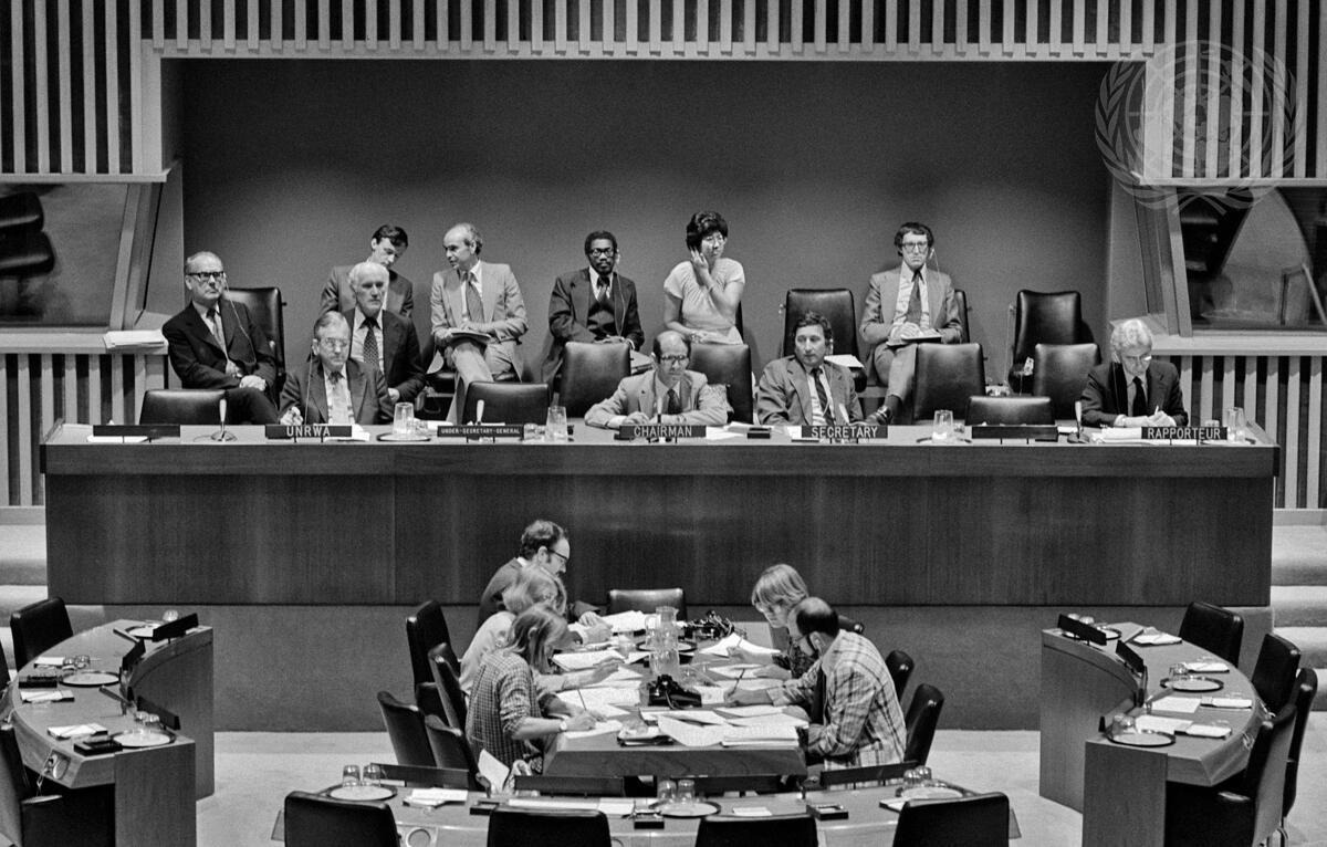 A partial view of the meeting. At the presiding table, from left: Olof Rydbeck, Commissioner-General of UNRWA; Hammond El-Choufi (Syria), Chairman of the Committee; Gustav Ortner, Committee Secretary; and Paul Cotton (New Zealand), Rapporteur.
