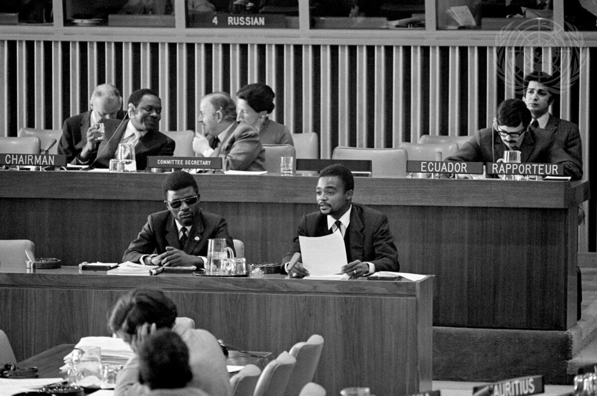 Paul Touba (right), of the Revolutionary Government of Angola in Exile (GRAE), making a statement.