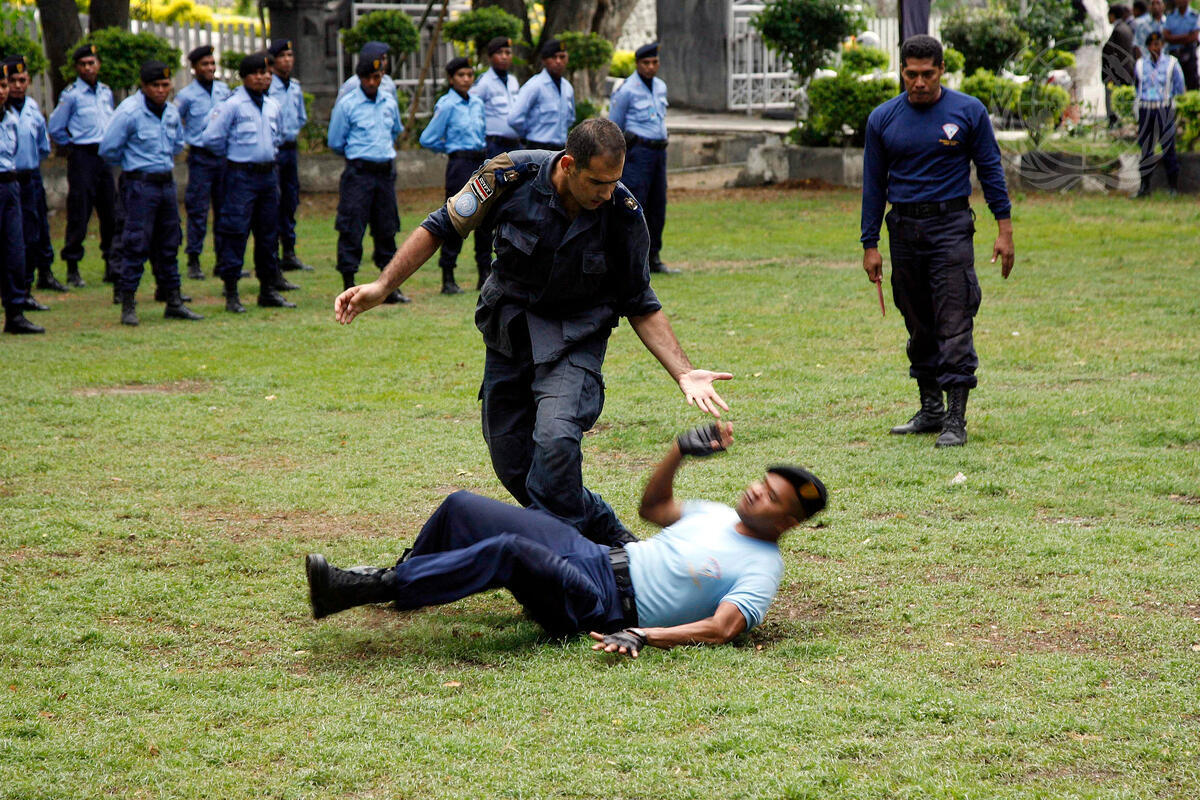 A United Nations Police (UNPOL) instructor (centre) teaches new tactics to Timorese National Police (PNTL) officers, as part of the on-going efforts of the United Nations Integrated Mission in Timor-Leste (UNMIT) to reform, restructure and rebuild PNTL.