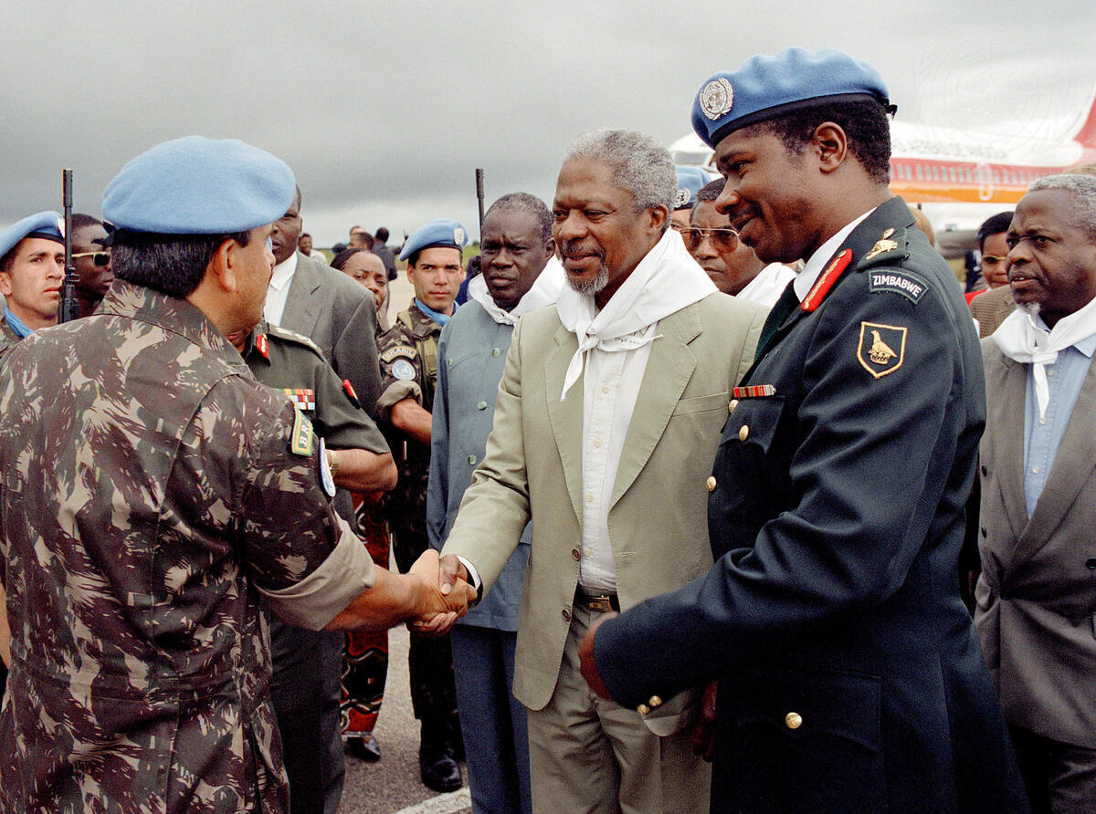 Secretary-General Kofi Annan (third from right) shakes hands with a member of Brabat (Brazilian Battalion), part of the United Nations Angola Verification Mission III (UNAVEM III). Force Commander Major General Philip V. Sibanda is second from right.