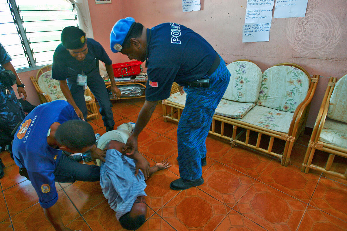 United Nations Police (UNPOL) personnel reenact an arrest, as part of the on-going efforts of the United Nations Integrated Mission in Timor-Leste (UNMIT) to reform, restructure and rebuild Timorese National Police (PNTL).