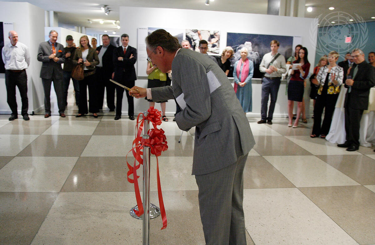 Arjan Paul Hamburger, Deputy Permanent Representative of the Netherlands to the United Nations, cuts a ribbon to officially launch the opening of the 2008 World Press Photography Exhibition.