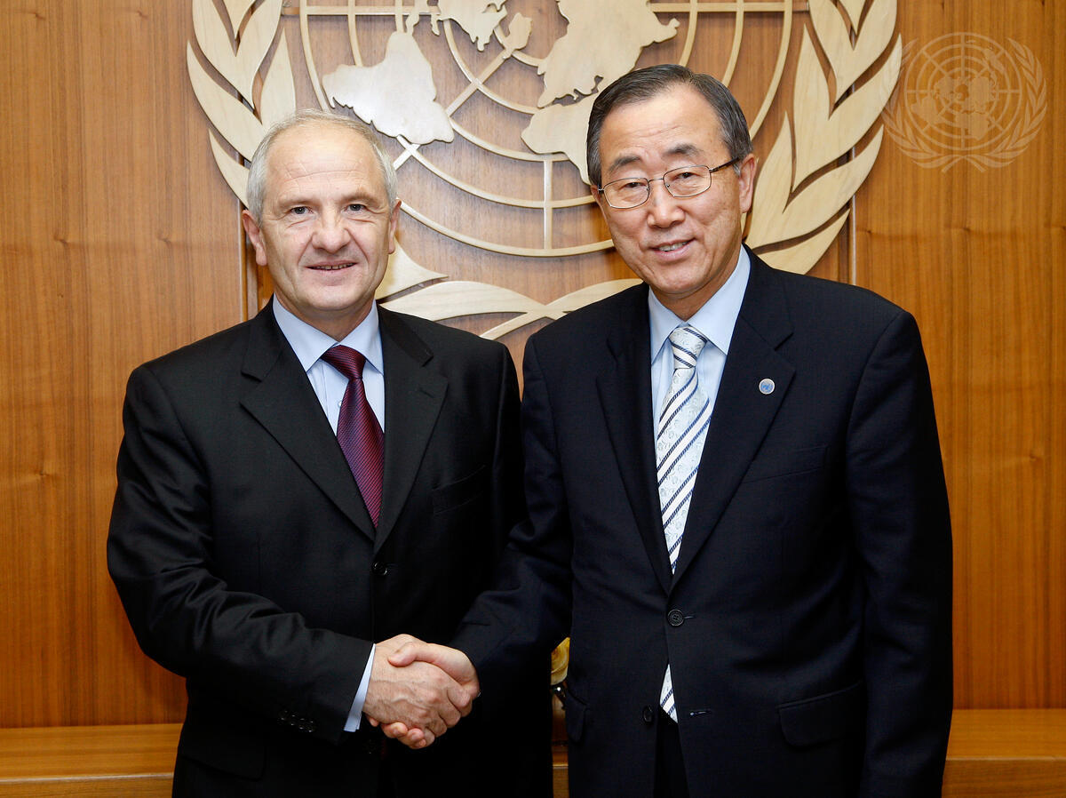 Secretary-General Ban Ki-moon (right) meets with Fatmir Sejdiu, Representative of Kosovo.