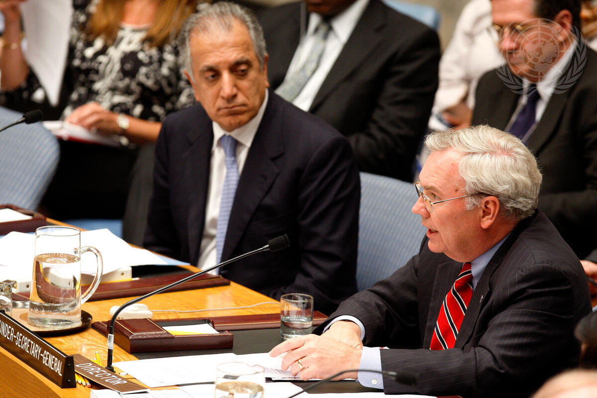 B. Lynn Pascoe (second from right), Under-Secretary-General for Political Affairs, addresses a Security Council meeting on the latest developments in Zimbabwe, as Zalmay Khalilzad (left), Permanent Representative of the United States of America to the United Nations, and President of the Security Council for June, looks on.