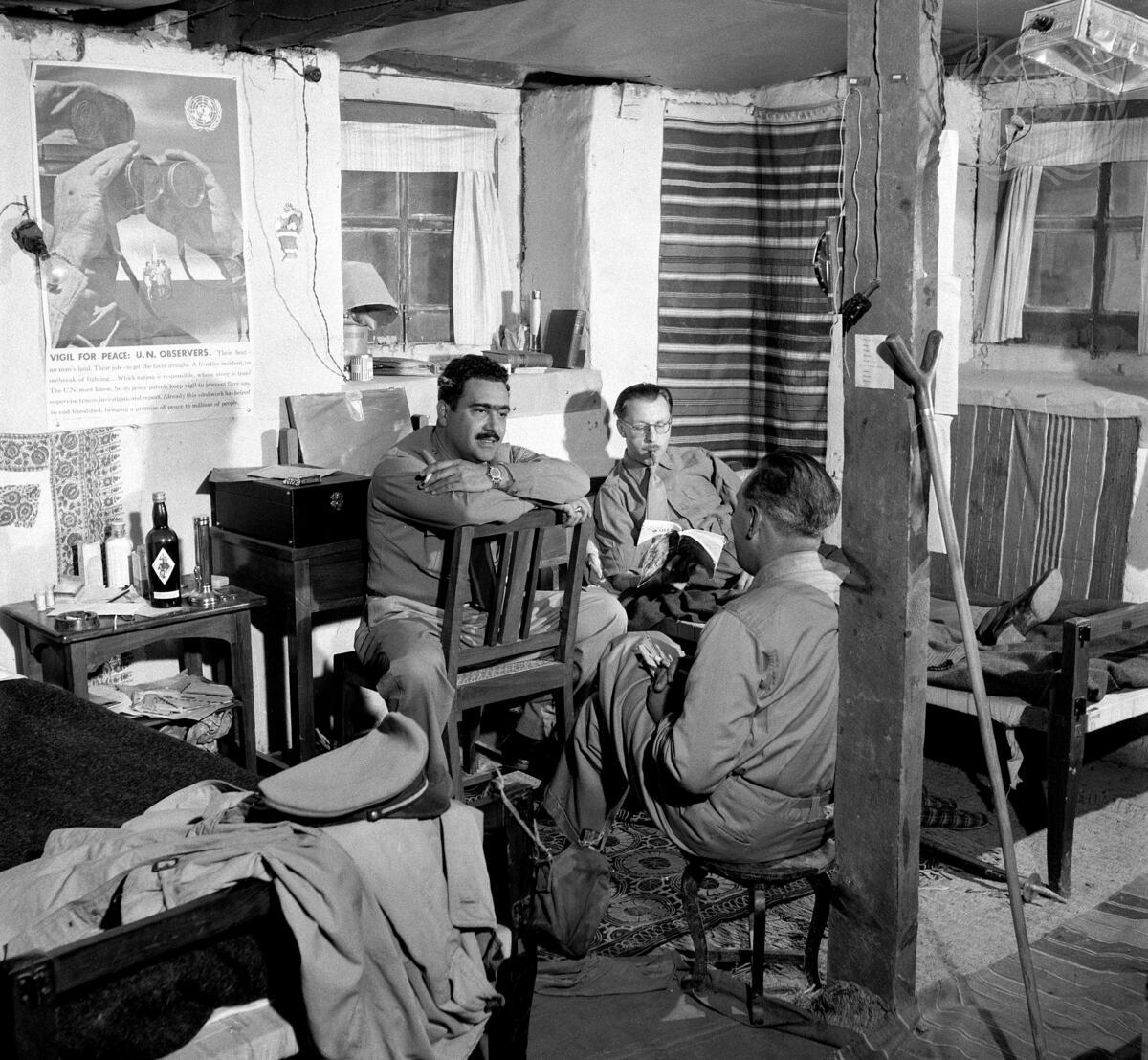 The members of a field team of the UN Military Observer Group in India and Pakistan spending a quiet evening in their living quarters at the Tangdhar station. At this station, the military observers and UN radio operator are quartered in a mud hut which they share with the headquarters of an Indian battalion.