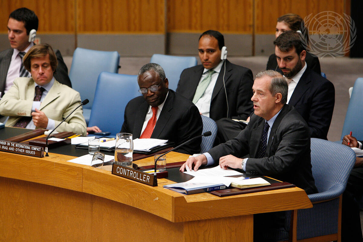 Warren Sach (right, front row), Assistant Secretary-General and Controller for the Office of Programme Planning, Budget and Accounts, briefs the Security Council on the Development Fund for Iraq (DFI) and the International Advisory and Monitoring Board (IAMB), in his capacity as the Secretary-General's representative on the IAMB. Also attending the meeting: Ibrahim Gambari (second from right, front row), Special Adviser of the Secretary-General on the International Compact with Iraq and Other Issues.