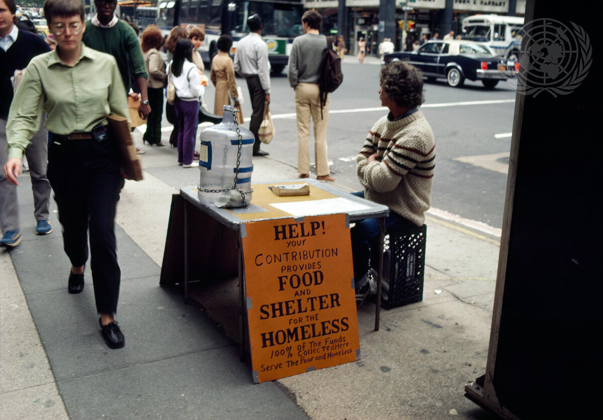 On a Manhattan street close to Grand Central Station, a Good Samaritan sets up shop, appealing for financial aid for the thousands of poor and homeless in the city.