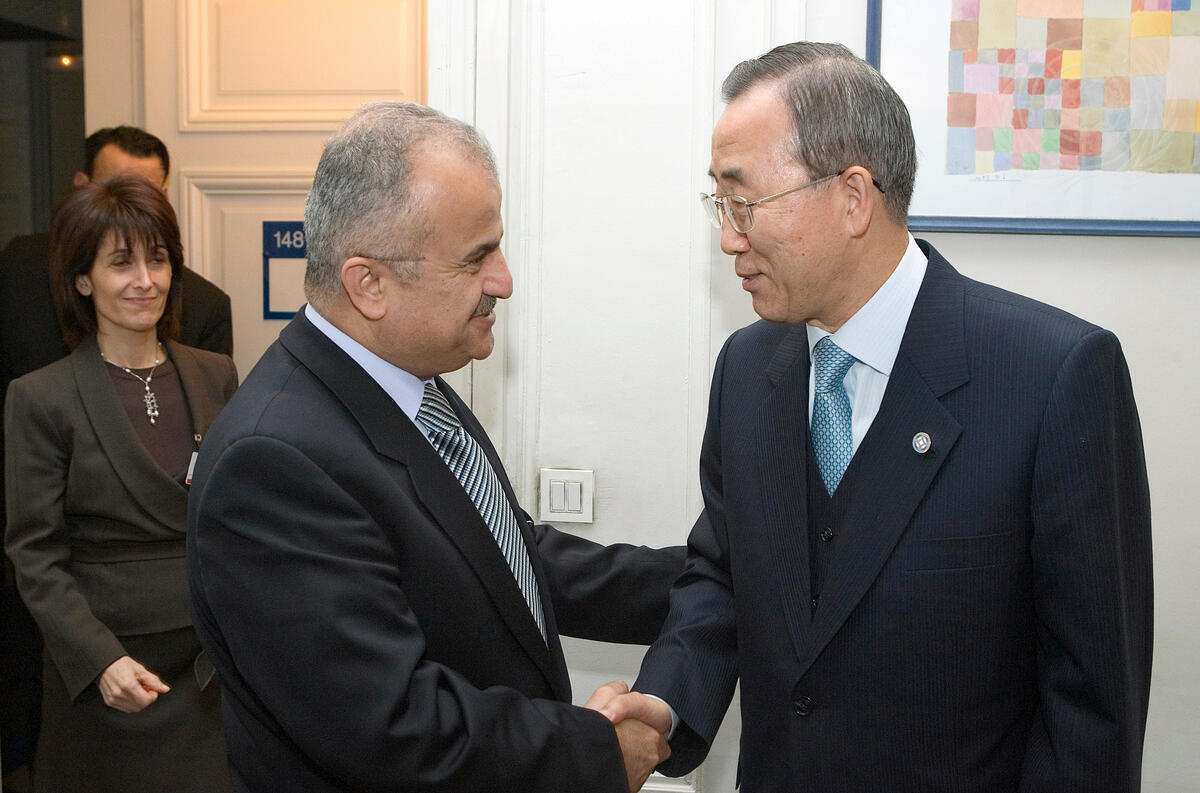 Secretary-General Ban Ki-moon (right) meets Abdelelah Al-Khatib, Foreign Minister of Jordan in Paris, France, where Mr. Ban is attending the International Conference on Support for Reconstruction and Development of Lebanon.