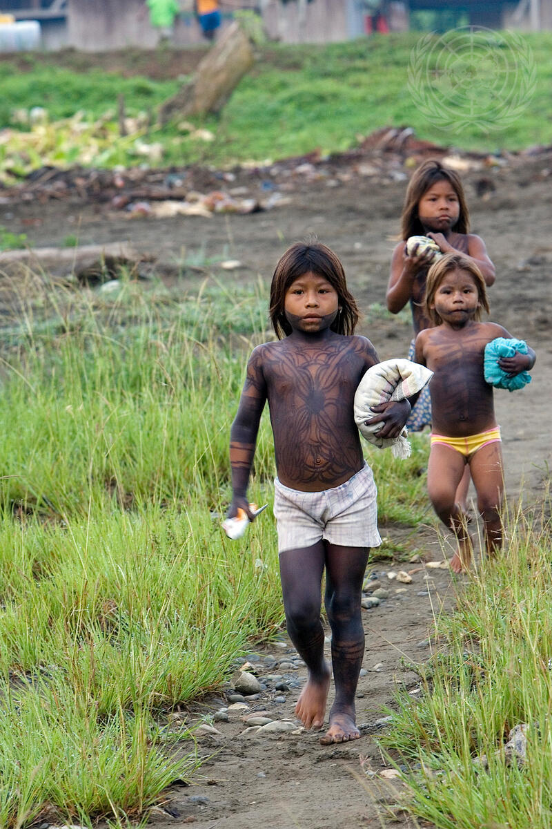 A view of indigenous children from the Embera people, displaced by armed conflict. There are over two million internally displaced persons in Colombia and while forced displacement is always a very difficult experience, it is doubly catastrophic for indigenous communities. Indigenous culture is closely linked to the land and displacement often leads to the total collapse of traditional authority and cultural patterns.