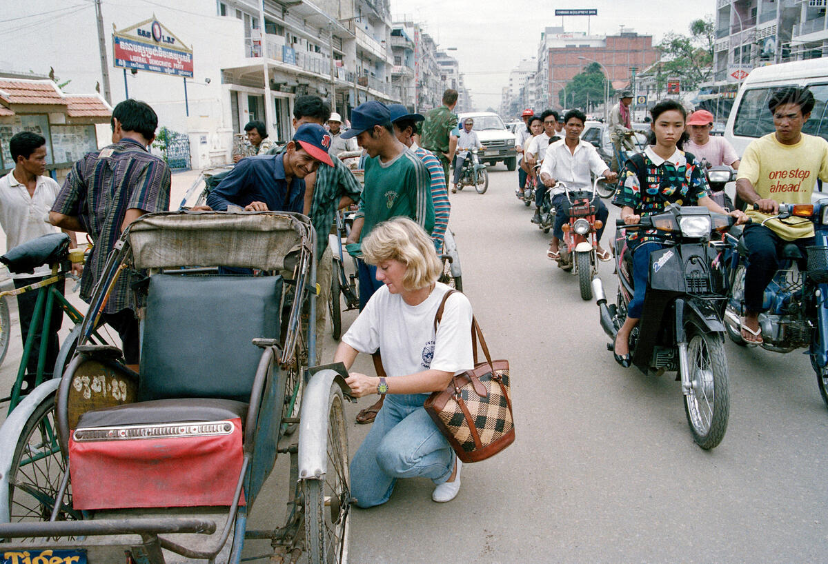 An United Nations Transitional Authority in Cambodia (UNTAC) staff member (centre, kneeling) of the Community Relations Office fixes a safety reflector on a cyclo in Phnom Penh.