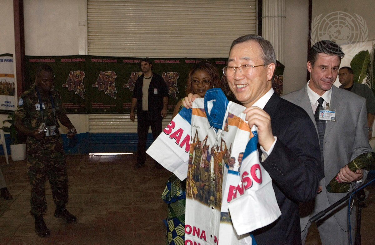 United Nations Secretary-General Ban Ki-moon, on a two-day visit to the Democratic Republic of the Congo (DRC), displays a shirt given to him by staff when he visited the Eastern Division Headquarters of the United Nations Organization Mission in the Democratic Republic of the Congo (MONUC), in Kisangani.