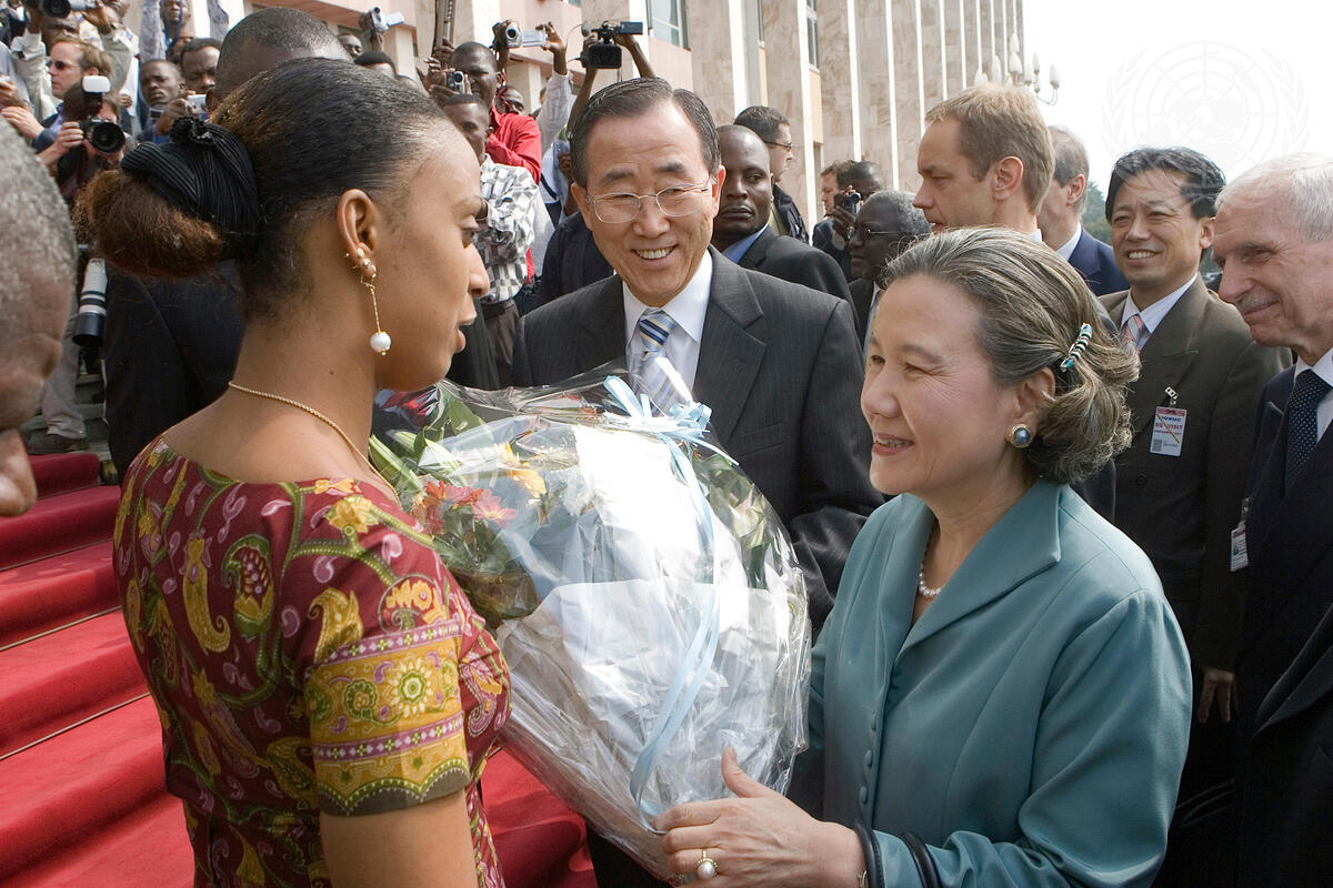 United Nations Secretary-General Ban Ki-moon's wife Yoo Soon-taek (front, right), accepts a bouquet of flowers when the Secretary-General (centre), arrived for a meeting with Vital Kamerhe, President of the National Assembly of the Democratic Republic of the Congo (DRC), in Kinshasa.