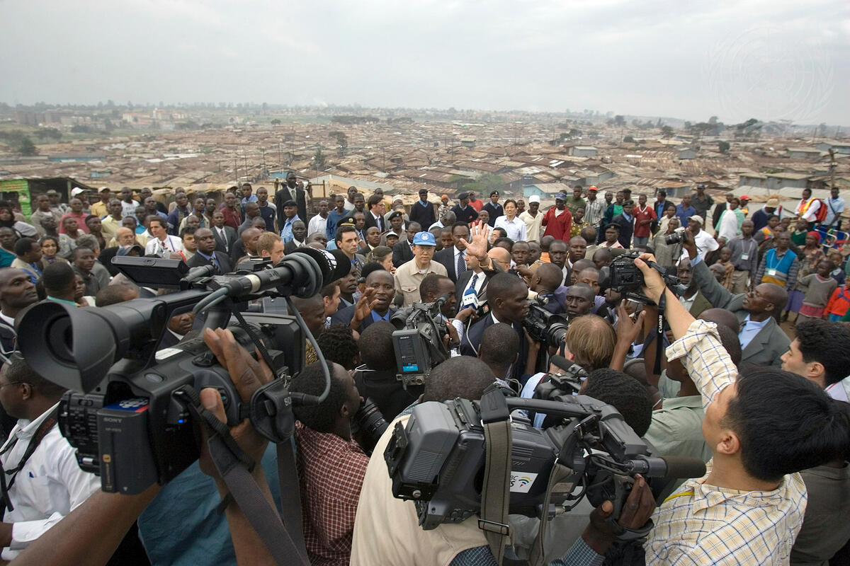 United Nations Secretary-General Ban Ki-moon (with UN cap, centre) briefs correspondents during his visit to a section of the crowded Kibera UN-HABITAT slum project, in Nairobi, Kenya.