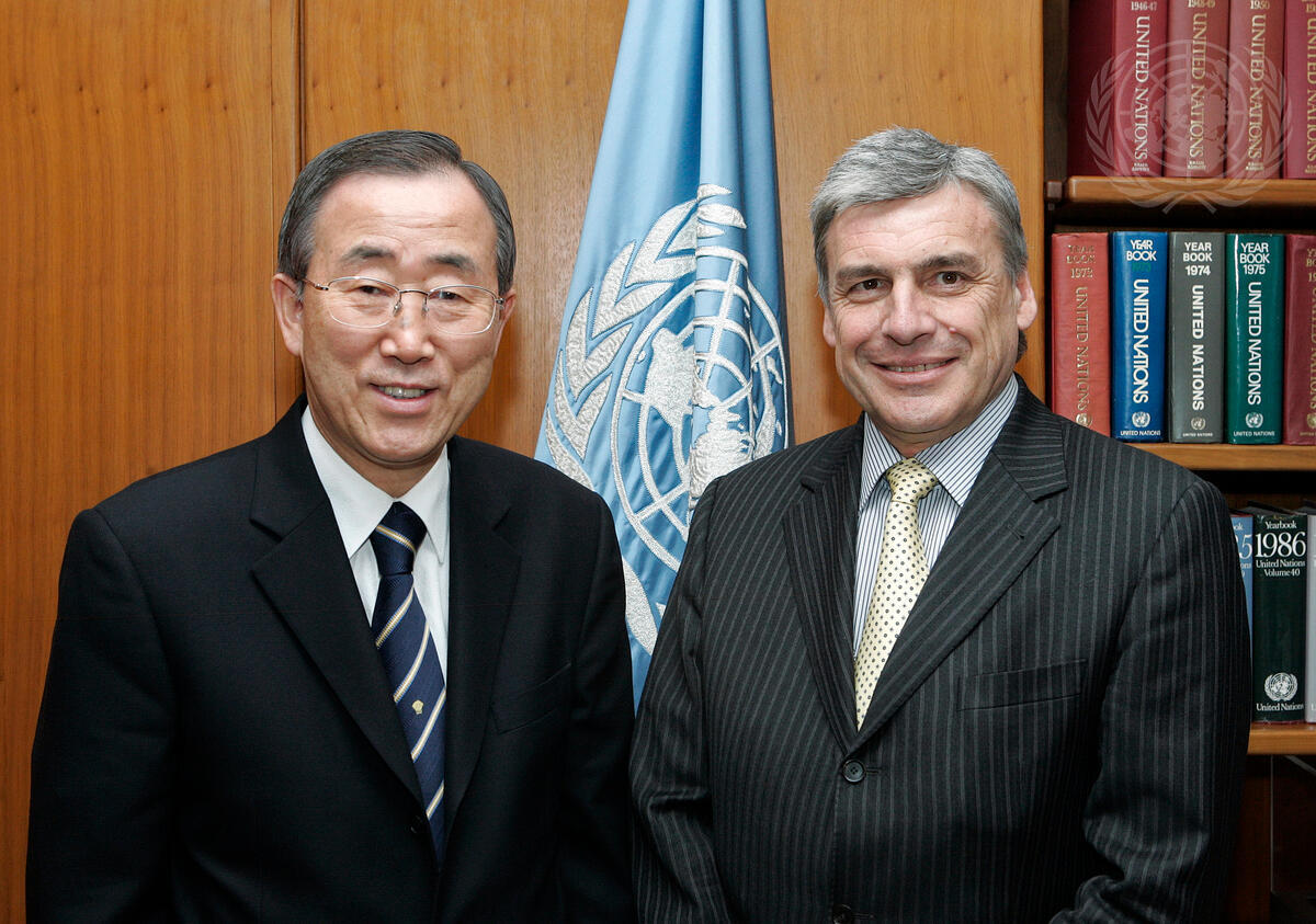 United Nations Secretary-General Ban Ki-moon (left) meets Jean de Ruyt, Ambassador of Belgium to Italy, at United Nations Headquarters in New York.