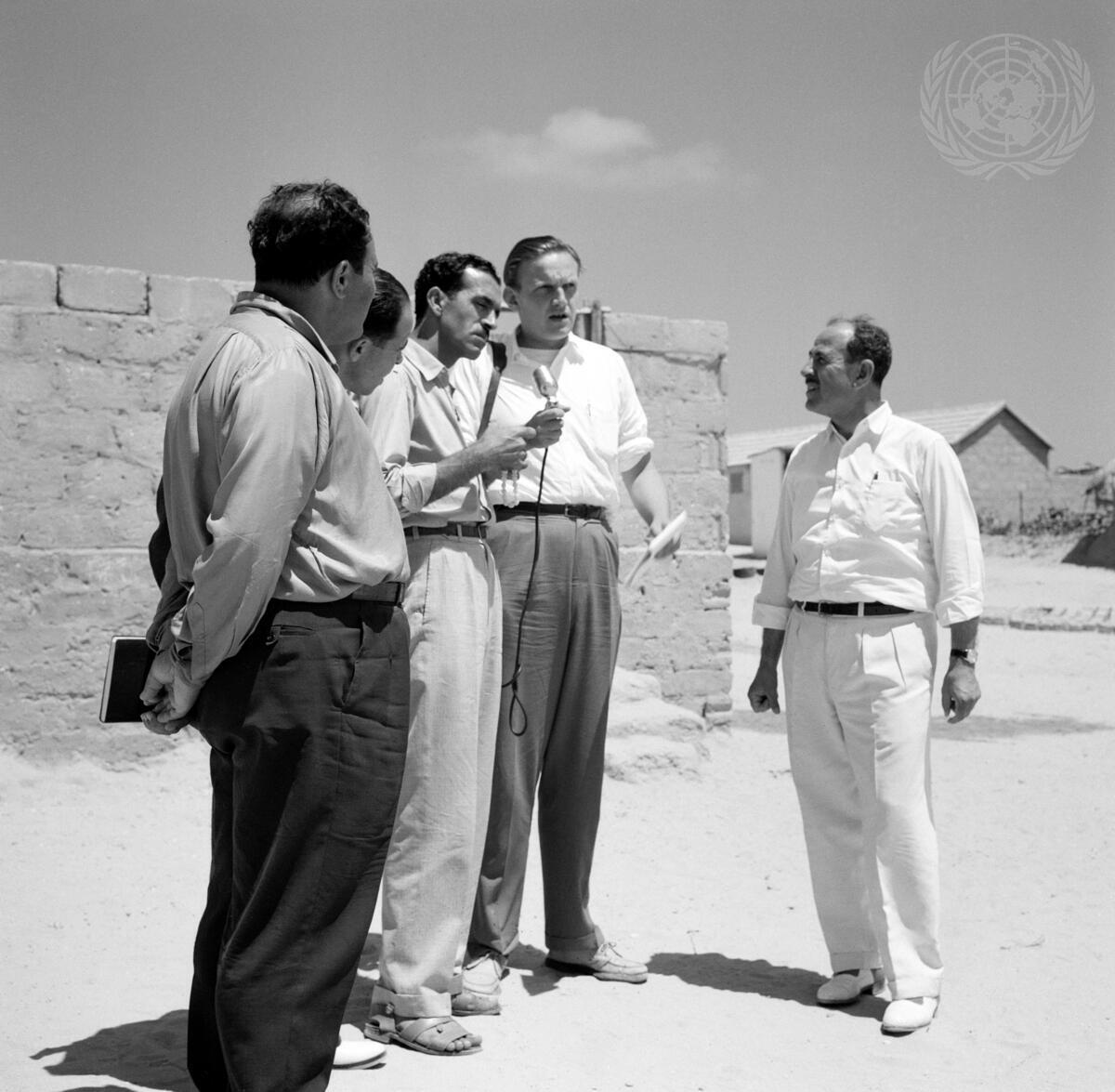 This photograph was taken in one of the refugee camps of the UN Relief and Works Agency for Palestine Refugees in the Near East (UNRWA), the Deir El Ballah Refugee Camp, as a refugee from Jaffah, Mr. Mohammed Muhsen (3rd from left), was interviewed by Mr. Gary Stradling, UN Emergency Force (UNEF) Public Information Officer. 1959.