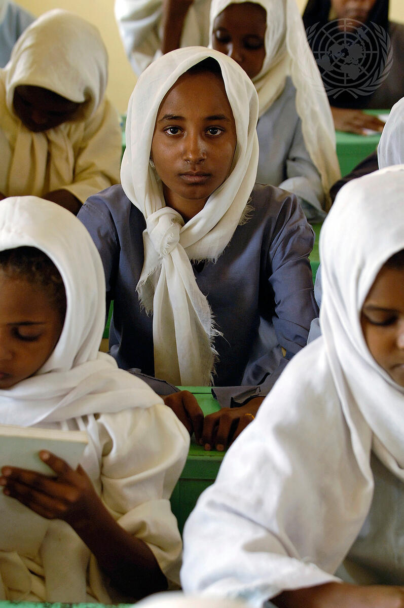 School girls attend classes in a school built by the United Nations High Commissioner for Refugees (UNHCR) in Wad Sherife refugee camp. The school operates two shifts -- one in the morning for girls, and the other in the afternoon for boys, to provide education to the many refugee children in Sudan.