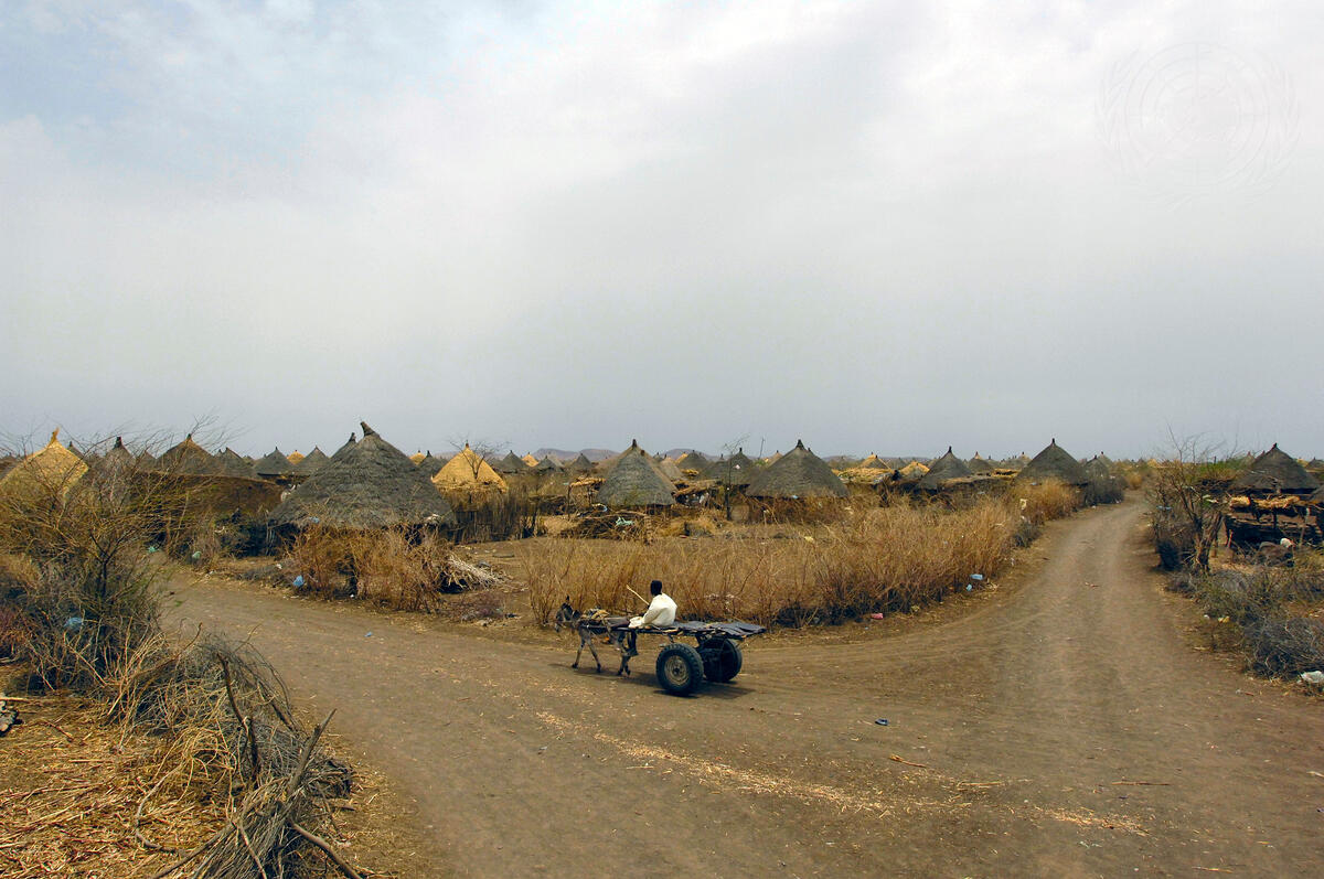 A view of a refugee riding his mule-buggy through the United Nations High Commissioner for Refugees (C refugee camp in Sudan.