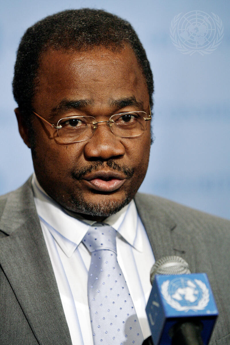 Pascal Gayama, Deputy Permanent Representative of the Republic of the Congo to the United Nations, and President of the Security Council for August, speaks to news correnspondents outside the Security Council chamber, at UN Headquarters in New York.
