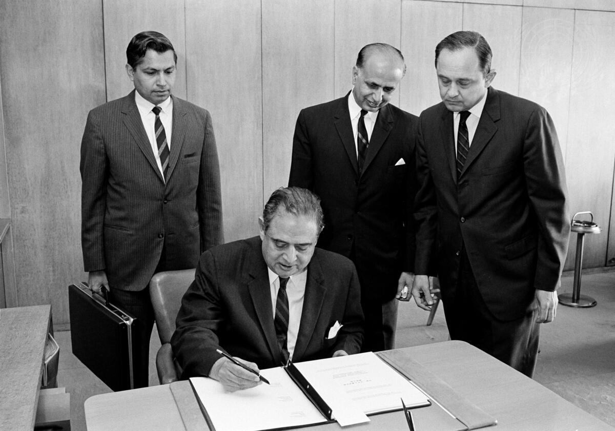 Ambassador Syed Amjad Ali, Permanent Representative of Pakistan to the United Nations signing the Convention. Looking on are: (left to right), Mr. Naseem Mirza, First Secretary, Pakistan Mission to UN; Mr. Mohammd Sarfraz, Counselor, Pakistan Mission; Mr. Blaine Sloan, Director of General Legal Division, United Nations.