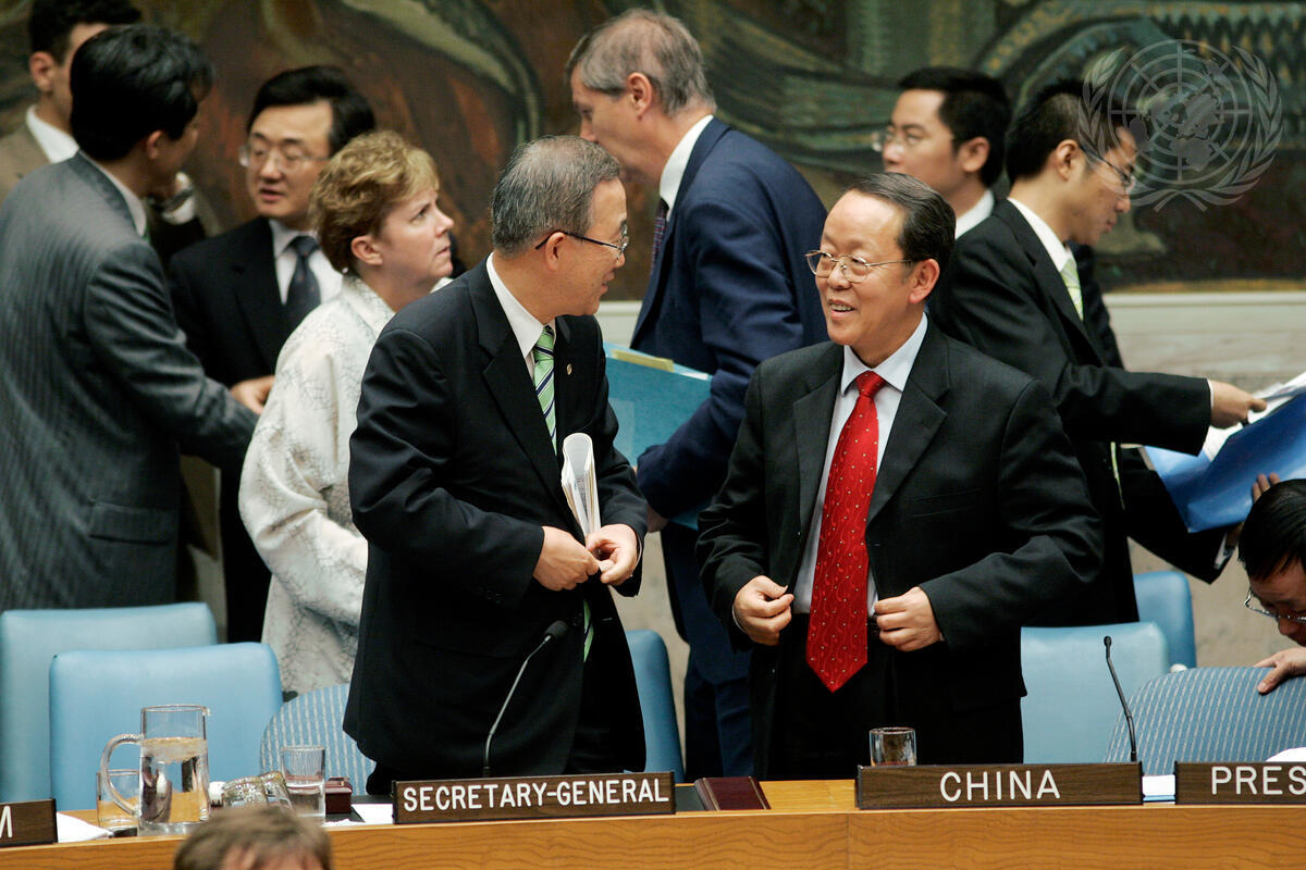 Secretary-General Ban Ki-moon (left) confers with Guangya Wang, Permanent Representative of the People's Republic of China, and President of the Security Council for July, before the start of the Council meeting to consider a report on the situation in Sudan, at UN Headquarters in New York.